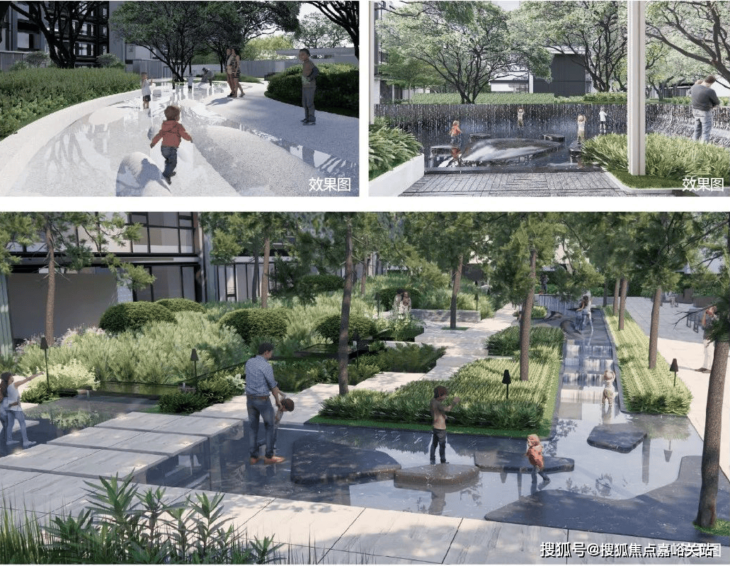 共七大活力主题花园,穿插在楼宇之间,定制每一栋独特的生活场景。同时还营造了三片戏水活力场,随着社区水流的流淌,形成“溪谷、悬瀑、落泉”不同的水景剧场。让生活场景向水而生,并逐渐向园林渗透,最终融入其中,形成水与景的和鸣之势,营造自然之上的意境。